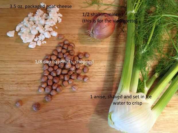 Aquí tenemos en la tabla de cortar queso de cabra (necesita es 3.5 oz paquete) y avellanas y 1/8 taza de ellas picadas. La original receta de bulbo de 1 hinojo. Pero no se pudo encontrar uno así que lo sustituimos por algo similar y añade sabor fantástico a la ensalada. Es un anís, que se afeitó y ponga en agua con hielo para crujiente para arriba.