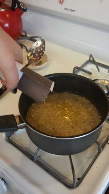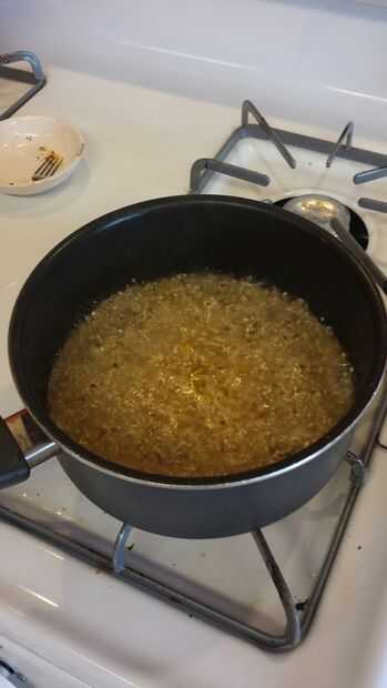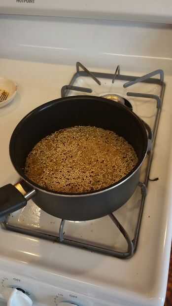 Las instrucciones en mi paquete de quinoa dicen poner la quínoa, 1 y 3/4 tazas de agua y una cucharadita de aceite a hervir, luego convertir calor a medio, agregar el paquete de especias y cubrir durante 15 minutos. El agua debe absorberse cuando se hace.