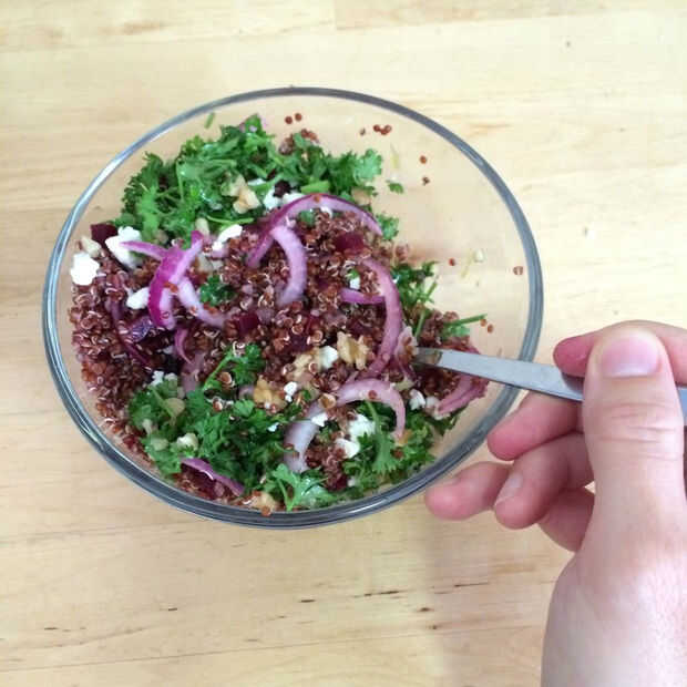 Lleno de sabor y color, esta ensalada hace un gran acompañamiento para cualquier comida.La quinua es un superalimento repleto de proteína y fibra.Las sobras hará un gran almuerzo para el día siguiente!Paso 1: Vinagreta de limón1/2 limón, exprimido1/4