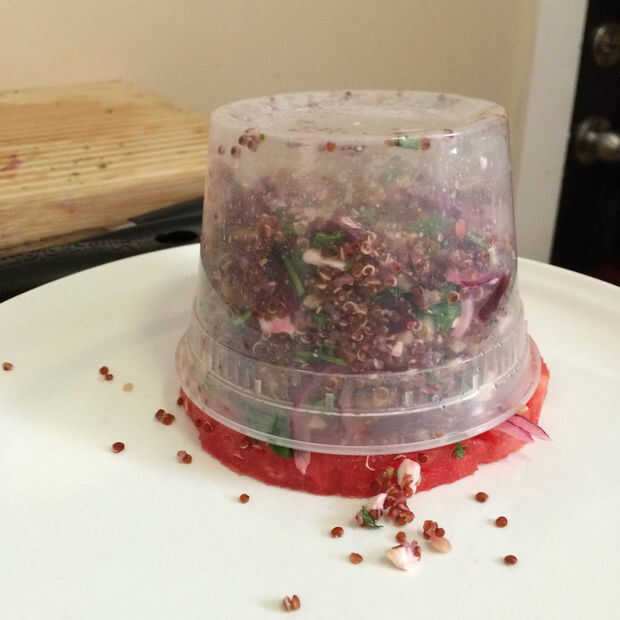 Usando mi mismo recipiente de la plantilla, lleno la ensalada en y había apisonado. Luego coloca la rodaja de sandía en la parte superior y había volteado para que la ensalada de quinoa sería perfectamente salir y sentarse en la sandía. Esto funcionó muy bien!