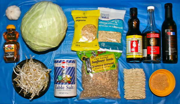 este es mi plato favorito de tiempo todos Oriental col ensalada!!!! Vamos a empezarPaso 1: Ingredientes y materiales Ensalada:-1 cabeza pequeña de col-6-8 verde cebolla-1 taza almendras trituradas-4 cucharadas semillas de girasol-1 paquete Mr.Noodle