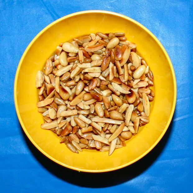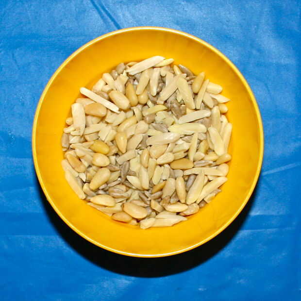 Para las tuercas, semillas de girasol 1 parte de cosechadora, 1 parte trituradas almendras y 2 piezas de piñones - con cada parte está entre 2 cucharadas y 1/3 taza dependiendo de cuántas personas necesita servir. Los piñones son bastante caros pero también muy distintivo en sabor y textura... Está bien ahorrar en costes omitiendo los piñones o usarlas exclusivamente y omitiendo los demás.