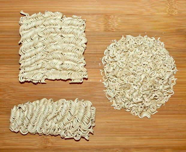 Romperán sus fideos ramen y aplastarlas para arriba en pedacitos pequeños. No utilice el paquete de sabor que viene con los fideos - o guardar para hacer sopa con o solo tirarla hacia fuera.