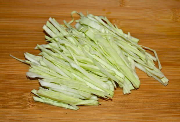 Cuarto y el Col de la base, luego desmenuzar las hojas exteriores, rebanar en tiras finas.