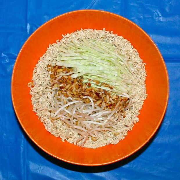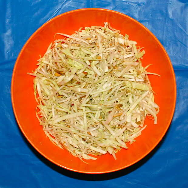 este es mi plato favorito de tiempo todos Oriental col ensalada!!!! Vamos a empezarPaso 1: Ingredientes y materiales Ensalada:-1 cabeza pequeña de col-6-8 verde cebolla-1 taza almendras trituradas-4 cucharadas semillas de girasol-1 paquete Mr.Noodle