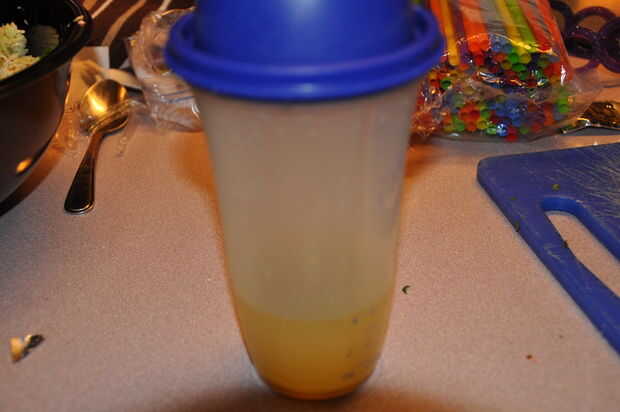 Ahora agregar 2 cucharadas de azúcar, 1/2 taza de aceite de oliva, vinagre blanco 3 cucharadas, pimienta al gusto, el sabor del pollo de sus fideos, y 1 cucharadita de sal juntos y agitar bien en su envase.