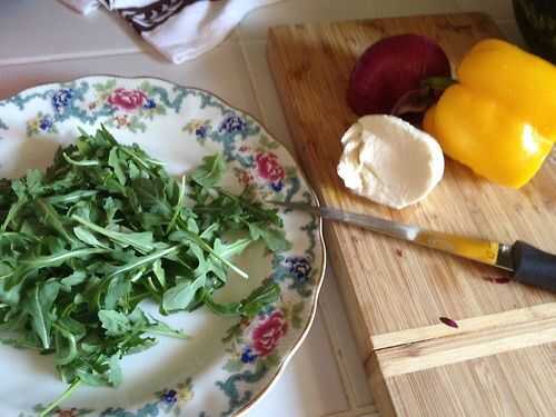 ■Baby rúcula ■1/2 pimiento amarillo ■1/4 rodajas de cebolla roja ■1 en rodajas tomate ■5 rebanadas de mozzarella fresca ■3 picado hojas de albahaca fresca ■Olive aceite, vino tinto o vinagre balsámico, S & P