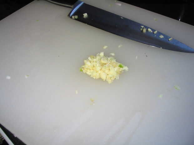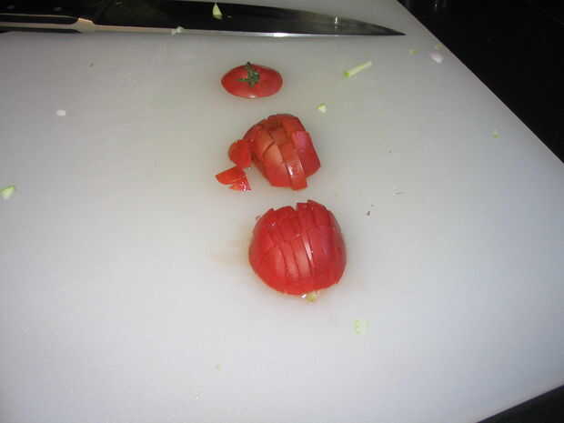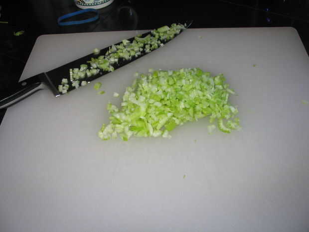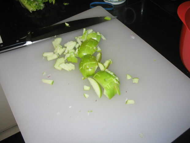 Picar el apio, cebolla morada, manzanas, tomates y ajo.