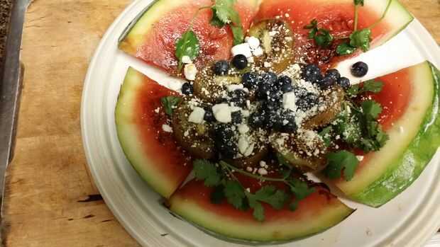 Montar la Sandia, kiwis y arándanos, espolvorear con queso Feta o cabra, vierta el puré por encima y disfrutar.