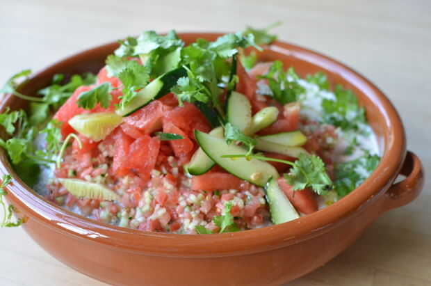 Ingredientes de perifollo1 lb de 7-8 sandía sin semillas (a la mitad), enfriadao 4 pequeñas sandías sin semilla (por ejemplo, Dulcinea)1/2 taza aceite de oliva virgen extra3 limones, jugo1 1/2 cucharadita de sal3/4 de cucharadita de pimientahojas de