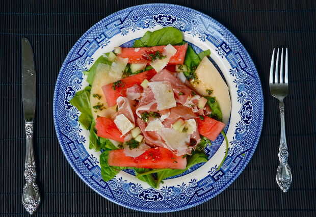 La dulzura del melón es el complemento perfecto para el jamón de parma. El perifollo delicado y aderezo de menta agrega frescura y la corteza de la sandía en vinagre agrega un poco de crunch y acidez.