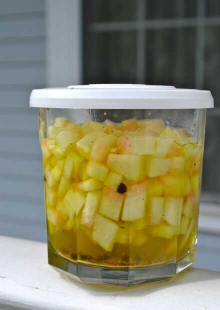 Para hacer la corteza de sandía en escabeche rápido, combinar el vinagre, la sal, el azúcar y la pimienta en una cacerola. Darle un hervor suave hasta que el azúcar se disuelva. Añadir la corteza de sandía en cubos a un tarro de cristal y vierta la mezcla líquida en el vaso. Déjelo enfriar a temperatura ambiente y poner en la nevera para acelerar el proceso a lo largo.
