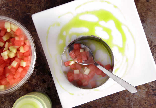 Es ideal para su uso placas de frías para este plato. Rociar el aceite de menta en la placa en un patrón decorativo muy simple (el aceite se moverá y deslice más de una salsa emulsionada, por lo que patrones complejos no funcionan bien). Lugar un anillo de postre * en el plato y la cuchara en el pepino y el melón de la mezcla. Presione suavemente hacia abajo en la parte superior de la ensalada para ayudar a mantener su forma, pero no tan fuerte como para aplastar la fruta. Levante con cuidado el molde lejos. Espolvorear la placa y la parte superior de la fruta con sal marina. Raspar o proceso de granizado y colocar una cucharada generosa en la parte superior la mezcla de melón pepino. Intentar trabajar rápidamente con la granita, tienes un tiempo muy limitado antes de que se funda, y es sin duda el elemento más impresionante para mostrar bajo una luz negra. Servir de inmediato.