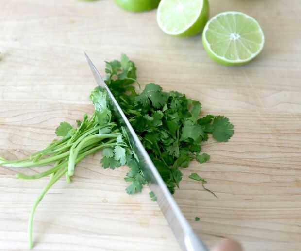 2. corte de la mayoría de los tallos expuestos de aprox. 10 tallos de cilantro (que va de 1/4 de taza) y picar finamente las hojas. Ponga a un lado.