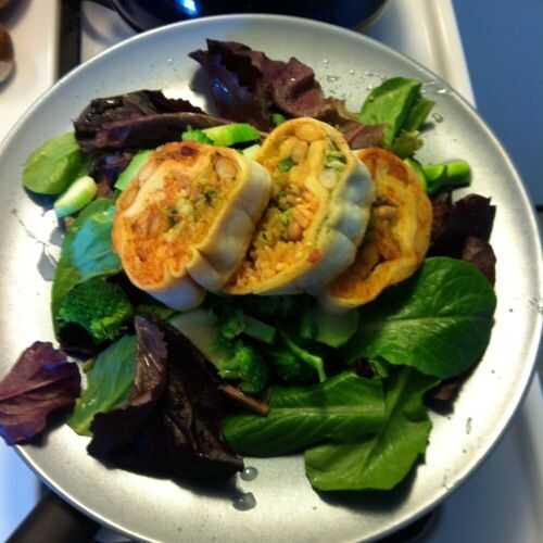 Burrito la mitad ensalada 1 Burrito frío de la nevera frondosa verdes vinagreta de sus cucharas de tbl opción 2 brócoli aceite de cocina y calabacín picado en trozos de tamaño brócoli vapor y calabacín, enjuague en agua fría, mezcla con verduras y vinagreta. Burrito de la rebanada en rodajas de una pulgada. Calentar una sartén de fondo pesada con el aceite, cuando el aceite esté caliente freír burrito rebanadas 3-4 minutos por cada lado (no cortar las piezas muy gruesas, de lo contrario serán frías en el centro). Rebanadas de Burrito será dorado. Colocar piezas de burrito sobre una toalla de papel para absorber grasa y luego transferirlos a la ensalada. Ir lite en la vinagreta si se puede, todo sobre el burrito. Disfrutar de