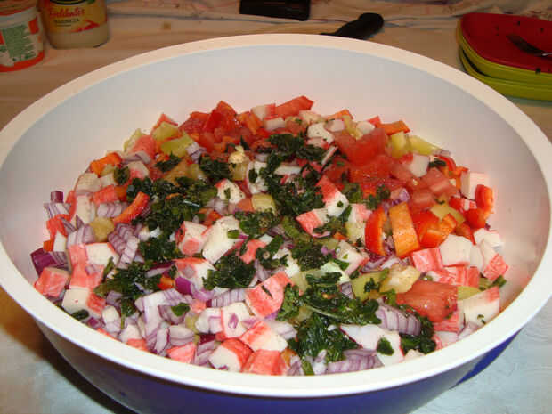 Cuando la pasta se cuece, drenaje de agua y recorren agua fría para enfriarlo. Poner en un cuenco y añadir todos los ingredientes: cebolla picada, pimientos, tomate y palitos de surimi, picadas encima de perejil, sal, pimienta y añadir la mayonesa y la crema. Mezclarlo todo para que todos los ingredientes están cubiertos en el aderezo en la misma cantidad.
