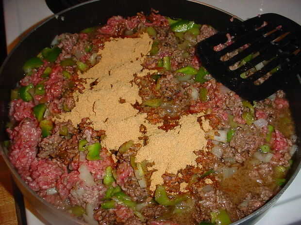 Una vez que la carne tiene algunas doradas y dado un poco de su jugo y las verduras han sudado un poco de humedad agitar en un paquete de condimento para tacos y dejar a fuego lento alrededor de 10 minutos o hasta que la carne esté completamente cocinada
