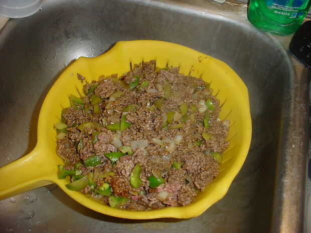 Cuando la carne está totalmente cocida, vierta la mezcla en un colador. Vierta una taza y media de agua en la sartén aún caliente y agregar los restantes 2 paquetes de condimentos taco mezclan bien y volver la mezcla de carne a la cacerola, revolver para combinar y deje para cocinar destapado hasta que la mayor parte de la humedad se ha ido