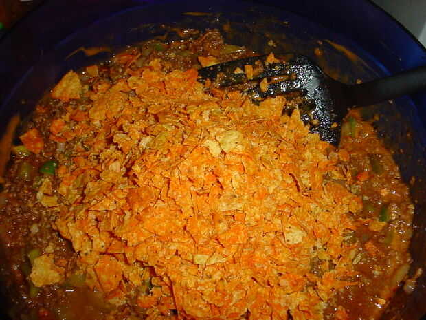 ingredientes:1 bolsa de Doritos 1 bolsa de condimento para tacos1 bolsa de queso mexicano 1 botella de aderezo Catalina1 cabeza de lechuga 1 libra de hamburguesa3/4 de taza de aguaPaso 1: Burger:1. Coloque 1 libras de hamburguesas en una sartén y coc