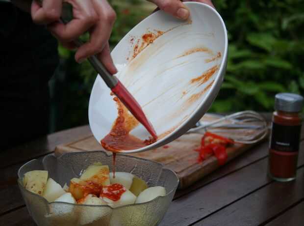 Vierte aderezo sobre las patatas. Utilice una espátula de goma para obtener cada bit de la bondad picante del recipiente. Agregar los chiles picados.