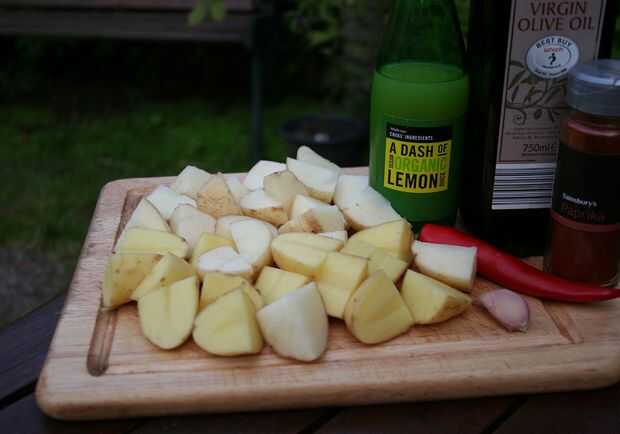 Fregar patatas bien y cortar en trozos de tamaño de un bocado. Tratar de que los trozos más o menos el mismo tamaño para que cocinen de manera uniforme.