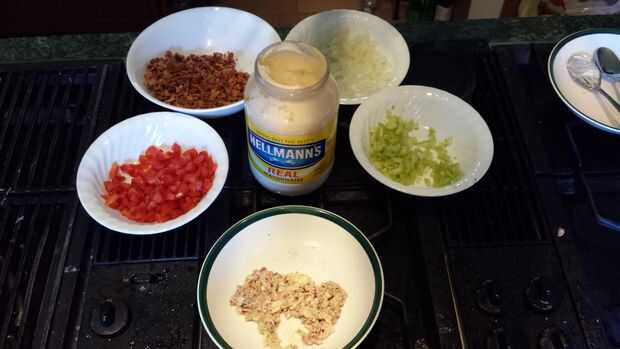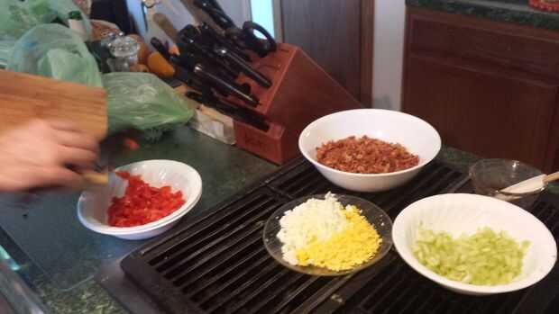 Mezclar la cebolla, pimiento, apio y huevo con los pedacitos de tocino.