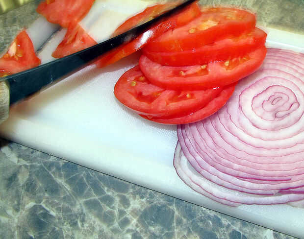 esta ensalada fácil y rápida es una buena alternativa a una ensalada. Sabroso, jardín de tomates frescos, queso feta picante, cebolla dulce y salado hierbas hará las delicias de su paladar.Paso 1: Los ingredientes Un jardín tomate maduroCebollaQueso