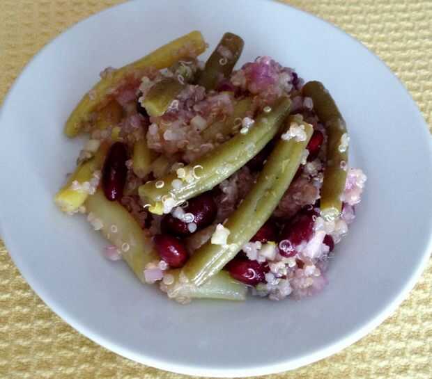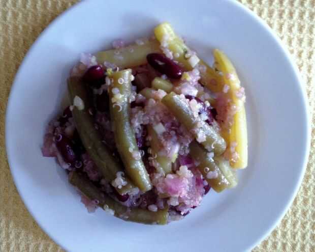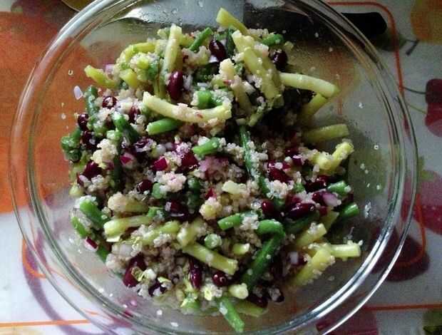 He usado verde y frijoles de cera de nuestro mercado de agricultores locales y añade las habas de riñón, también he hecho esta ensalada de garbanzos y pepinos, siente libre de usar lo que usted prefiere.