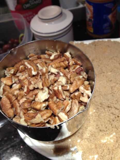 Una escasa taza de nueces picadas encima de la capa de azúcar moreno.