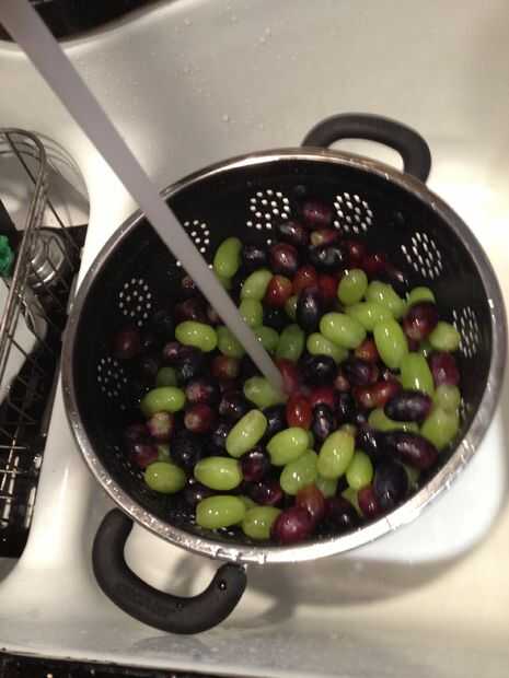 Poner el colador en el fregadero y lavar las uvas. No simplemente rociarlas, mezclar todo.