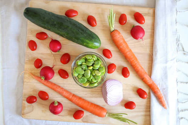 Utilice cualquier verduras son los más frescos en el momento! Maíz, pimientos, pepinos, tomates (aunque técnicamente una fruta yo soy amontonamiento lo en jaja), cebolla, rábanos, etc.. Sólo estoy usando lo que veía muy bien en el mercado esta vez. :)