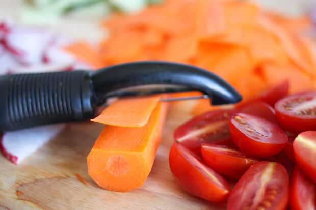 Para las zanahorias, pelarlas y cortarlas luego en 3-4 pulgadas piezas largas. Utilizar un pelador de verduras para afeitar hasta los corazones. Esto creará las rebanadas de zanahoria que son mucho más bonito y más fácil de comer.