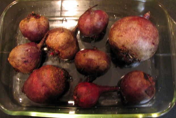 Lavar la remolacha, cortar los verdes apagado si está colocadas y ponga las raíces aún mojado en una asadera grande. Cubrir con papel de aluminio y colóquelo en un horno de 375F por poco menos de una hora.
