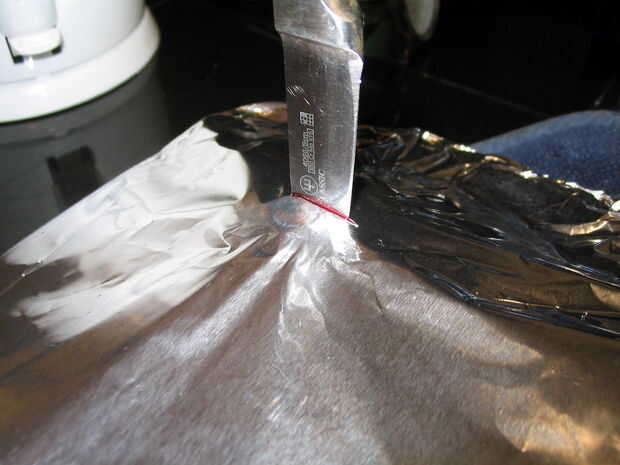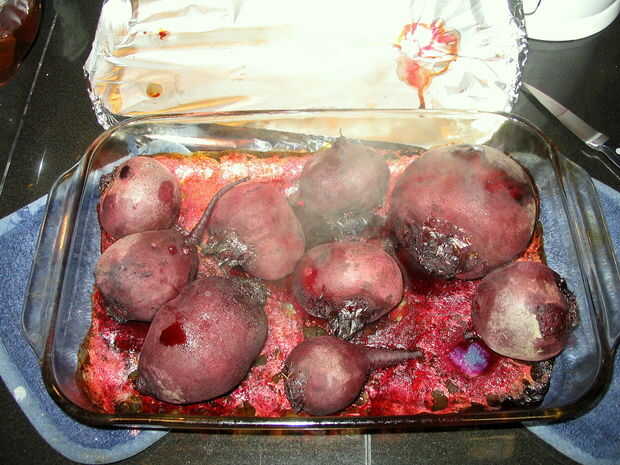Después de unos 45 minutos (o cuando la remolacha empezar que huele 'done') prueba apuñalando la remolacha más grande con un cuchillo de hoja delgada. Puede hundir directamente a través de la lámina para evitar retirar la lámina y dejar que el vapor hacia fuera.