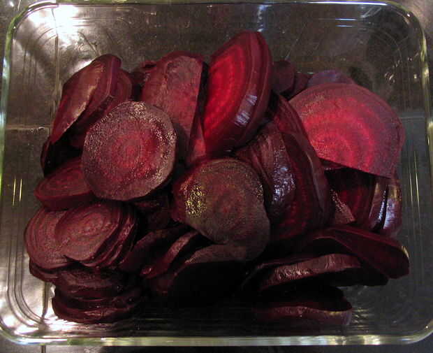 Cortar las remolachas en ~1/4 pulgadas redondos gruesos. Si la remolacha es grande, cortarlas por la mitad longitudinalmente antes de cortar para pedazos más manejables. Guárdelos en un recipiente de vidrio con tapa, como es probables que la mancha permanentemente un recipiente de plástico.