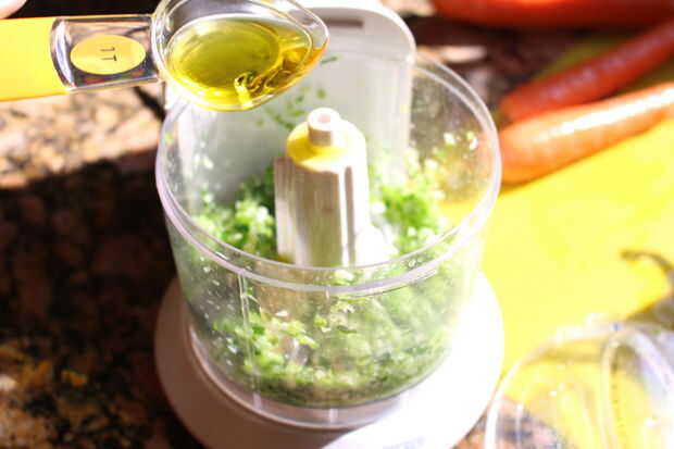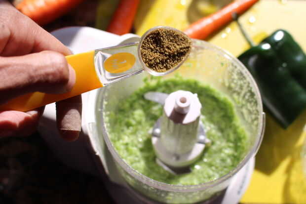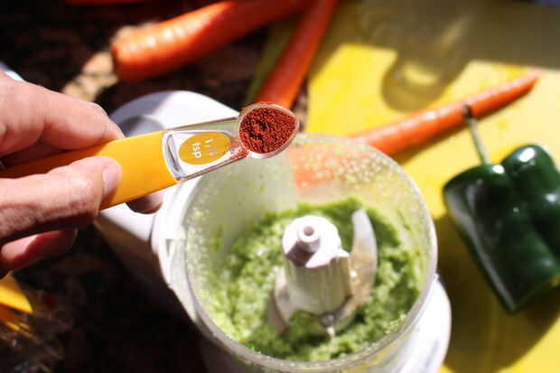 Agregar el Chile poblano, comino, pimentón ajo y aceite de oliva a la licuadora. Mezcla. Tenga en cuenta, probablemente no será 100% liso, pero usted no lo notará una vez que resulta en la ensalada.