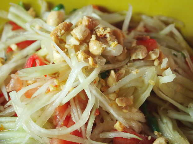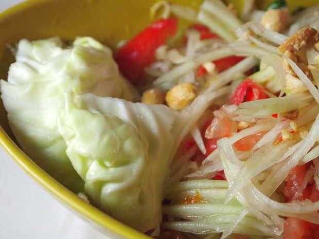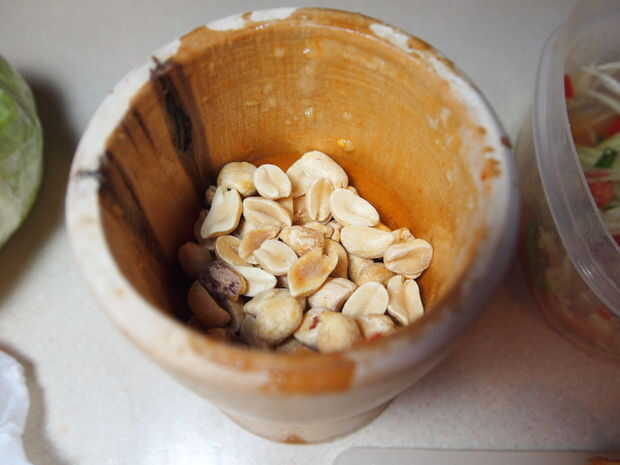 Ahora es el momento de degustar el plato y ver si necesita agregar un poco más azúcar de palma o un poco más pescado salsa de jugo de limón. También, si usted lo quiere más picante, utilizar el mortero y Maja para libra otro Chile o dos y añadir el resto del plato. Mezclar todo bien y a servir a tazón de fuente o placa de transferencia. Si desea agregar un lado de la col, hacer ahora. Y, para colmo - finalmente, libra su 1/4 de taza de maní y agregar a la parte superior de la ensalada.
