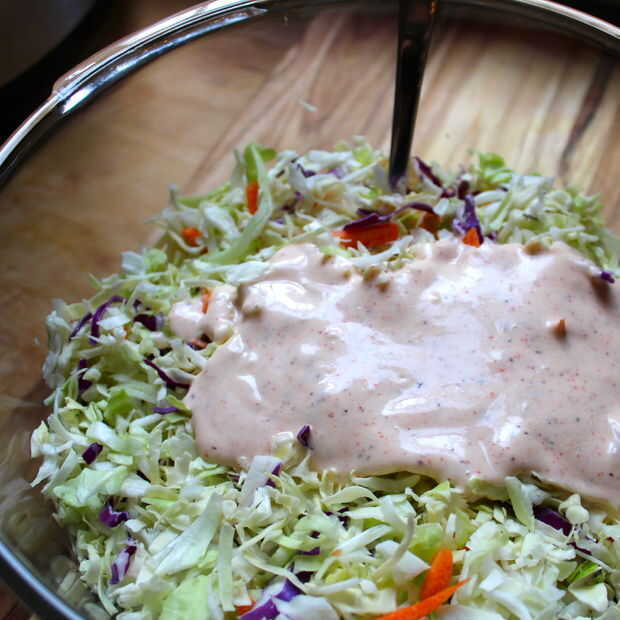 - Verter sobre la mezcla de col y mezclar como un loco hasta que todo está muy bien cubierto!