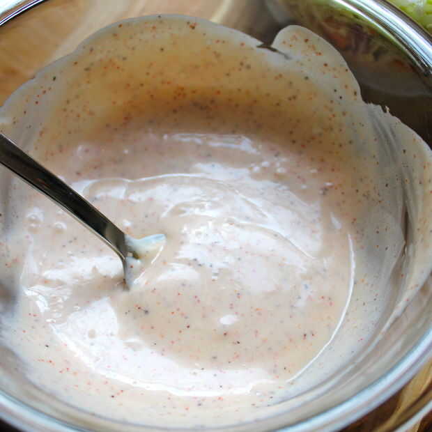 - Mezclar todos los ingredientes del aderezo en un tazón pequeño hasta que estén suave y agradable. En este punto es bueno probar y ver si le gustaría jugar un poco con él.