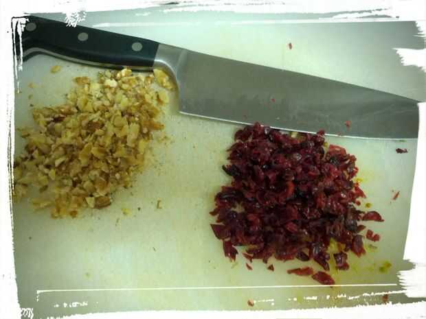 Cortar las nueces, arándanos, cebollín, pepino, apio, tomate y manzana. Rallar la zanahoria. Mezcle todo junto con la quinua cocida.