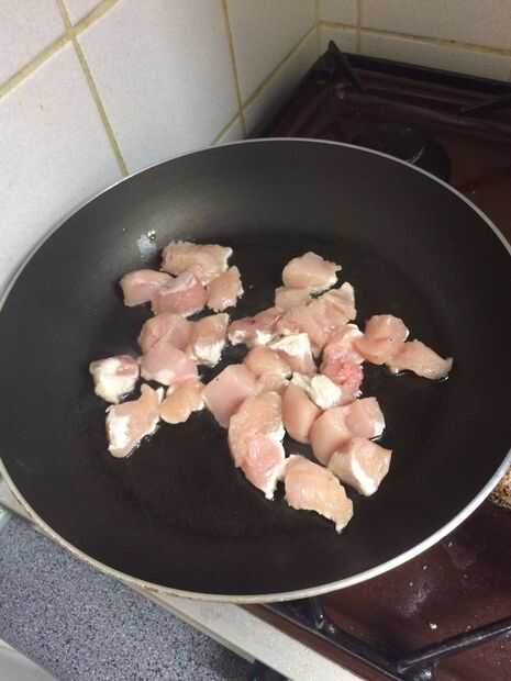 Después de pollo de corte, añadir a la sartén. Mover el pollo y está listo cuando ligeramente marrón.