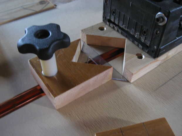 Usé mi sierra de calar para recortar el pico de la abrazadera de la placa de pie y el opcional. Usé una lámina espiral con 46 dientes por pulgada. 3/4 velocidad stock de pino es una pulgada de espesor... Una vez que todo el corte y lijado se hicieron utilicé un cuadrado para asegurarse de que los dos puntos donde en línea. Una vez que estaba feliz con eso luego perforé el agujero en la abrazadera para aceptar la T del hilo de rosca para el carril de ranura en T que fuera antes. La abrazadera opcional sólo se utiliza para cajas cuadradas completadas y marcos y la abrazadera T-Slot se utiliza para las cajas de tipo oblongo y marcos.