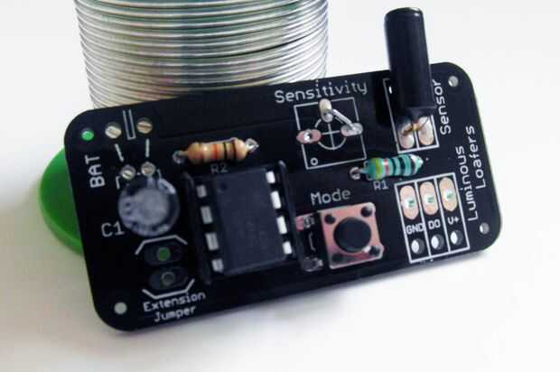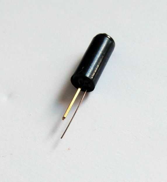 El sensor de vibraciones no tiene una polaridad y así puede conectarse de cualquier manera redonda. Para maximizar la sensibilidad es mejor orientarse paralelo a la superficie del tablero. Tan cuidadosamente doblar las piernas a 90 grados. Una pierna es muy delgada y elástica, esto no dobla muy bien pero como se dobla la pierna más gruesa entonces eso está bien. Deslice las piernas a través de la placa y soldar en su lugar.