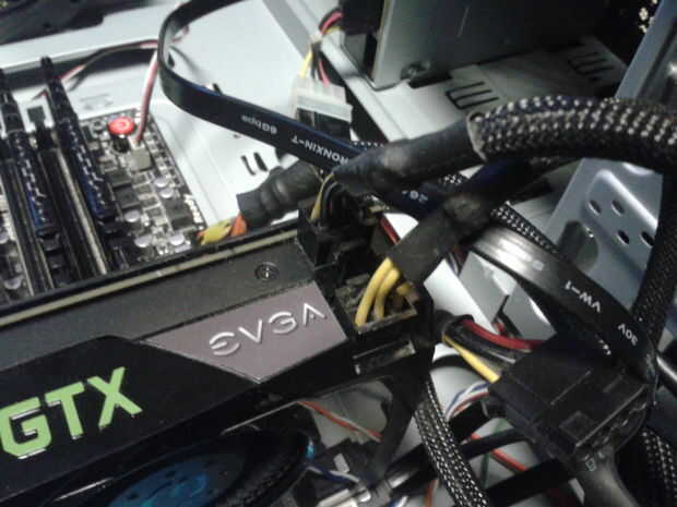 A veces las cartas extras que han instalado requieren energía adicional. Esta tarjeta gráfica por ejemplo requiere dos conectores de alimentación extra.