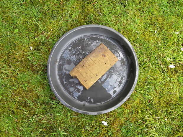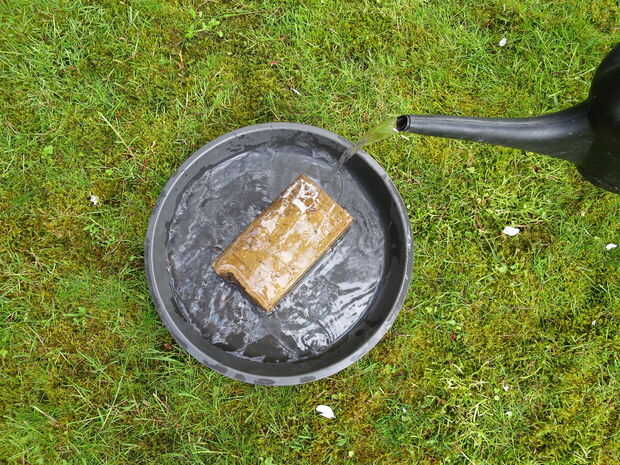 Colocar el ladrillo en medio de la pileta. Asegúrese de que el ladrillo no toca los bordes de los baños, por lo que no pueden escapar a las babosas. Ahora llénelo con agua! Poner a unos 3-5 cm (1, 1 - 2 pulgadas) de agua en la pileta, no más. Esto es porque no queremos erizos ahogar. Los pobres hijos de puta no que inteligente ;)