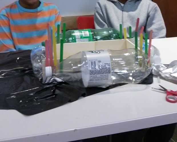 Teníamos una estación por grupo con una pistola de goma, rodillo de la cinta y tijeras. Después de media hora cada uno hicimos parada y comenzó el concurso flotante!