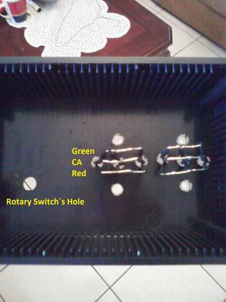 Una vez comprobado los 6 LEDs RGB, insertarlos en los zócalos instalados anteriormente donde se puede utilizar tubería de calor Shring. Tenga en cuenta que debe introducir cada LED con su extremo rojo hacia la parte inferior y para la formación de una línea se ser emparejar cada terminal de color de estos LEDs RGB sin azul terminal interconectando cada grupo de 3 LEDs con su color respectivo terminal.