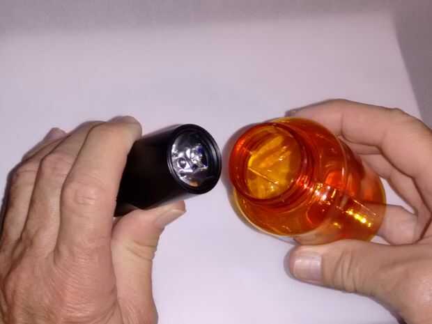 Simplemente retire la tapa y ver si la botella se coloca sobre la parte frontal de la linterna. Si cabe perfectamente eres mitad camino Inicio. Si es demasiado pequeño, entonces ver si cortando el cuello permitirá un mejor ajuste. Si eso no funciona, tal vez cortando la parte inferior de la botella permite sólo la parte en la lente de la linterna. Si eso no funciona, necesitará adquirir una linterna de tamaño diferente o botella de plástico. En cualquier caso, la idea es hacer un filtro de color para la linterna que filtra completamente toda la luz sin fugas de luz.