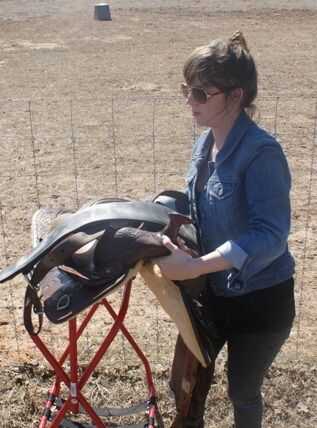 Para preparar la silla de montar, asegúrese de que la correa de cincha es colocada a la derecha de la silla de montar. Luego tapa la correa derecha de estribos y cincha sobre la silla de montar para conseguirlos fuera del camino. Esto hará que sea más fácil poner la silla de montar en el caballo.
