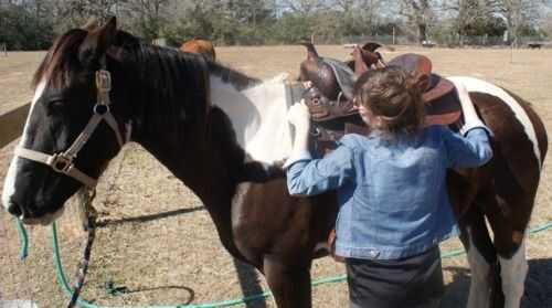 Pick up correas de la silla sujetando el lado derecho para arriba y acercarse al caballo desde el lado izquierdo. Ahora coloque la silla sobre el caballo con el cuerno derecho encima de la Cruz. Puede ajustar el sillín más una vez que esté en el caballo.